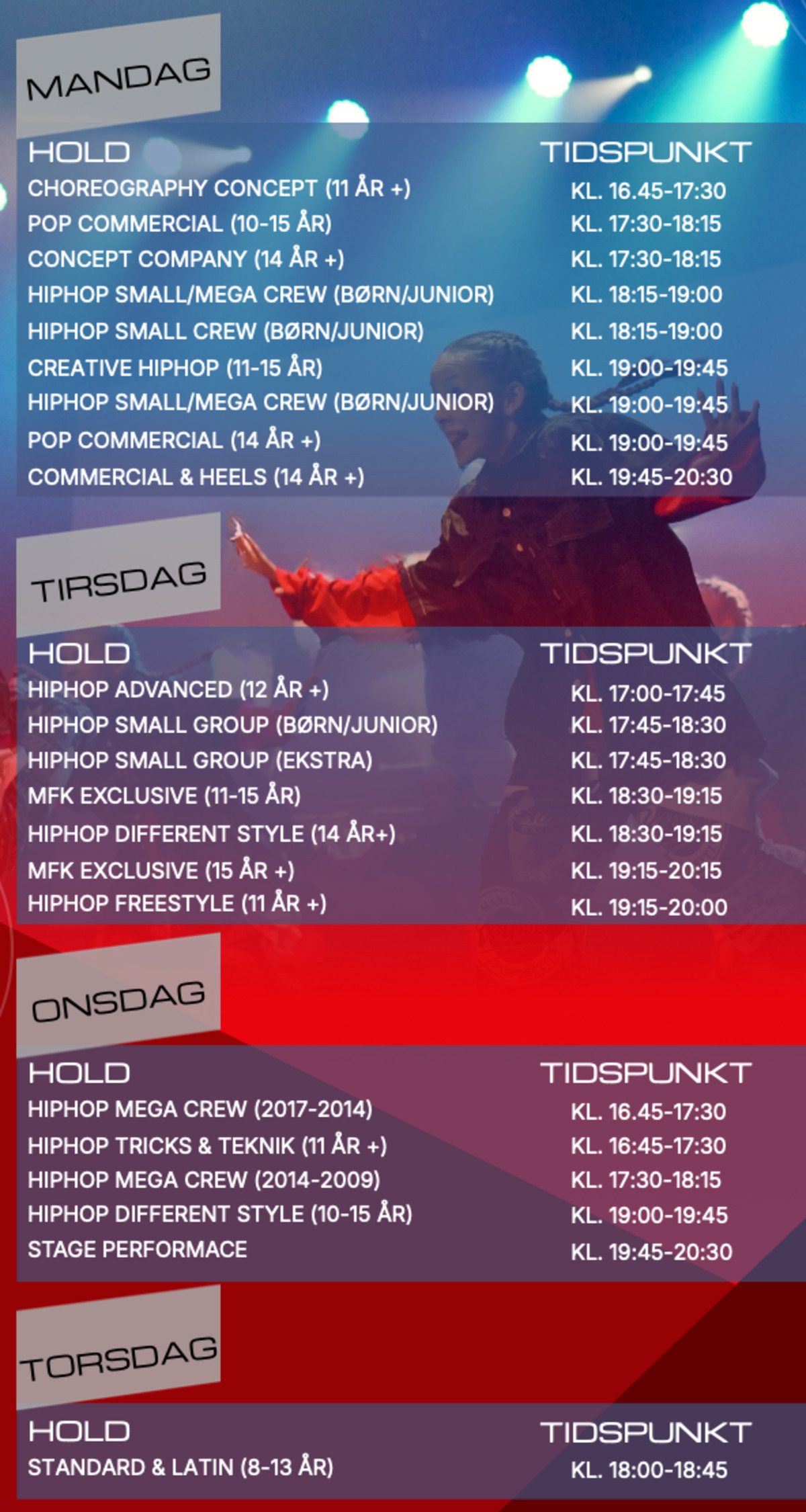 Her kan du se en oversigt over alle de dansehold, som vi tilbyder. Du kan læse mere om alle holdene og tilmelde dig under menupunktet "Tilmelding".