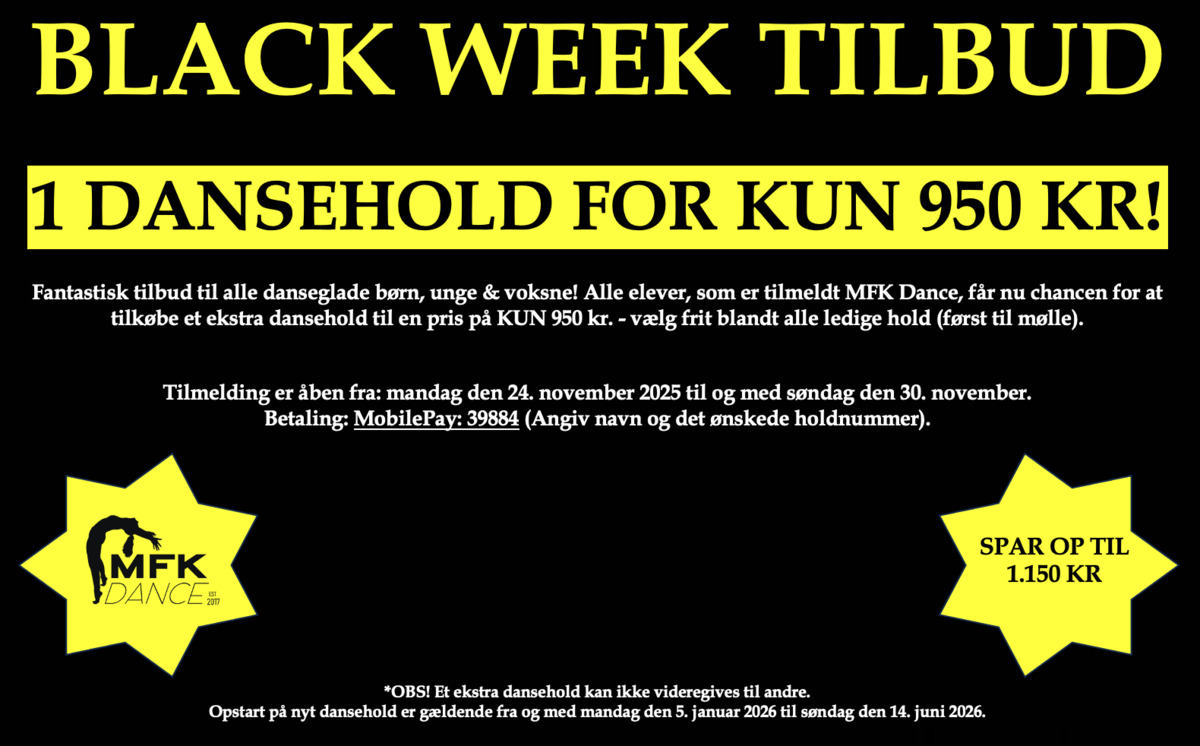 MFK Dance tilbyder 2 forskellige betalingsløsninger: Du kan vælge at betale den fulde pris som et engangsbeløb eller gøre brug af vores afdragsordning - se priserne herunder. Husk at vælge, hvilken en af betalingsløsningerne du ønsker ved tilmelding.